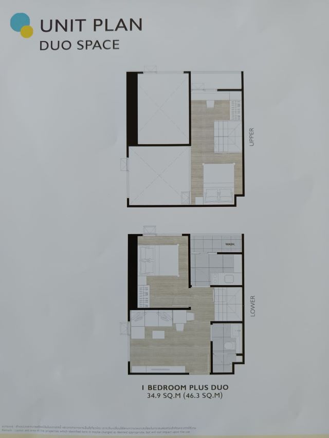 พื้นที่รวม 46.9 ตร.ม. (ชั้นล่าง 34.9 ตร.ม. + ชั้นลอย 12 ตร.ม.)