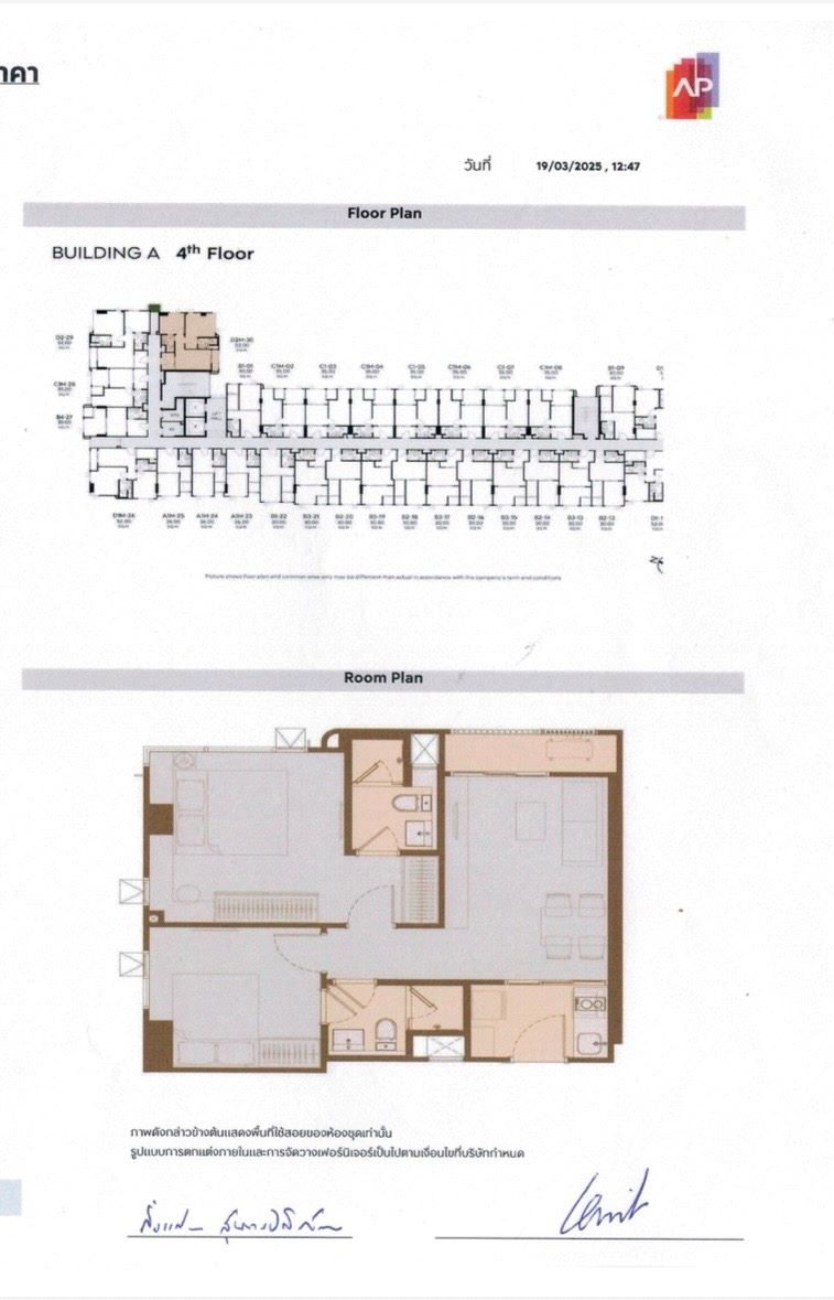 ตำแหน่งห้องชุด A4D2M30 เนื้อที่ 52 ตร.ม. 2 ห้องนอน 2 ห้องน้ำ 1 ห้องรับแขก ชั้น 4 ตึก A ฟรี Digital Door Lock